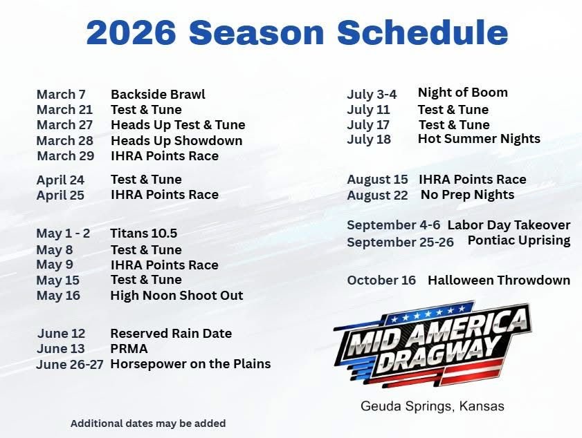 Mid America Dragway announces its 2026 Season Schedule packed with high-octane action, thrilling bracket races, special events, and family-friendly fun. Racers and fans can expect competitive showdowns, championship battles, and unforgettable weekends at one of the Midwest’s premier drag racing destinations.